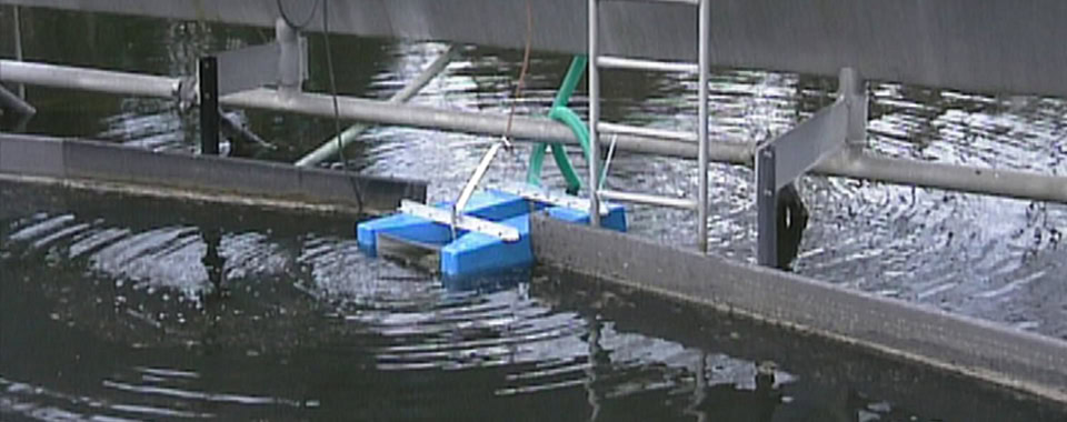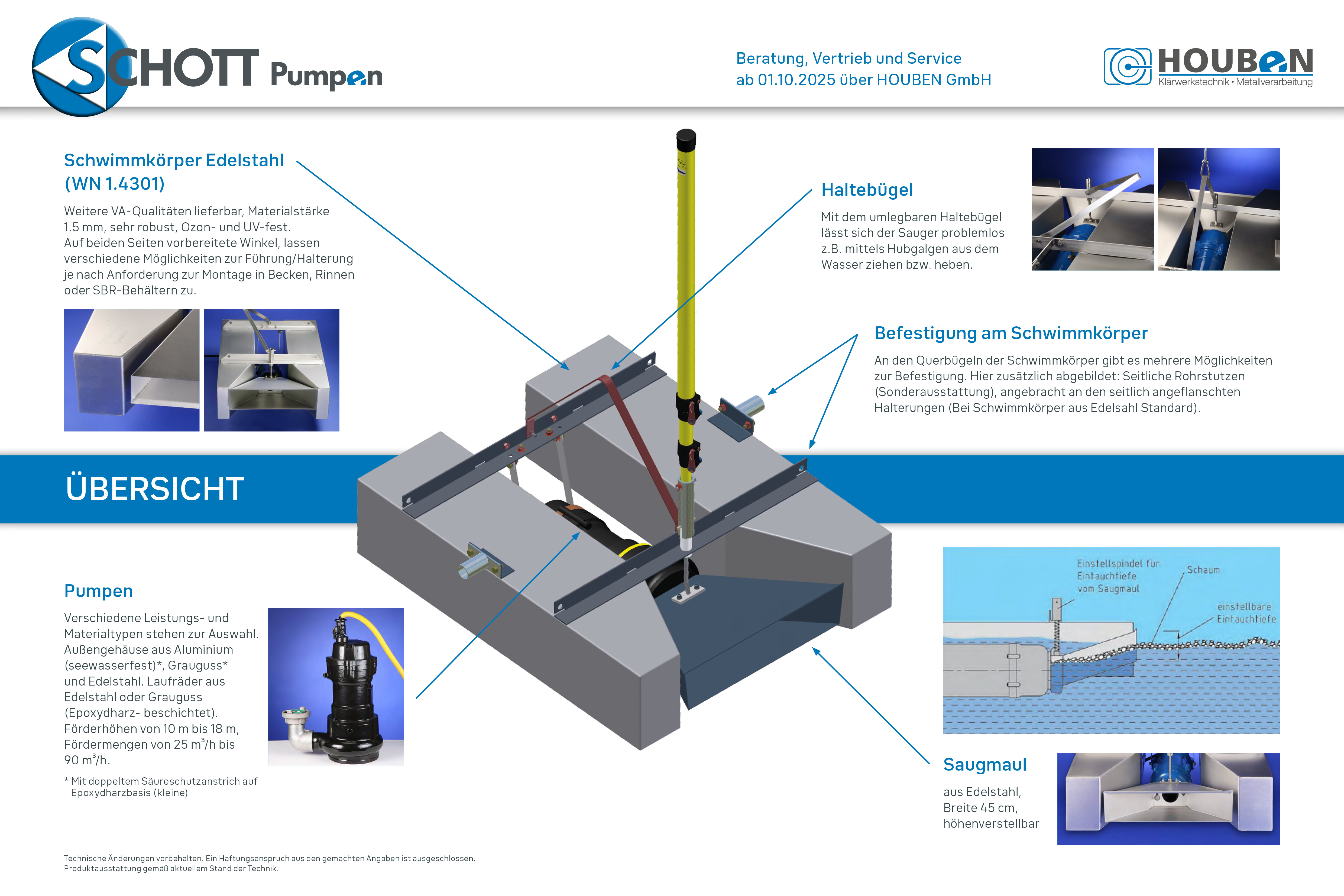 Der Schwimm- und Lackschlammsauger besteht aus einer horizontal auf der Wasseroberfläche schwimmenden Freistromrad-Tauch-motorpumpe mit seitlichen Schwimmkörpern und einem höhen-verstellbaren Saugmaul durch das die Wirkung noch optimiert werden kann.